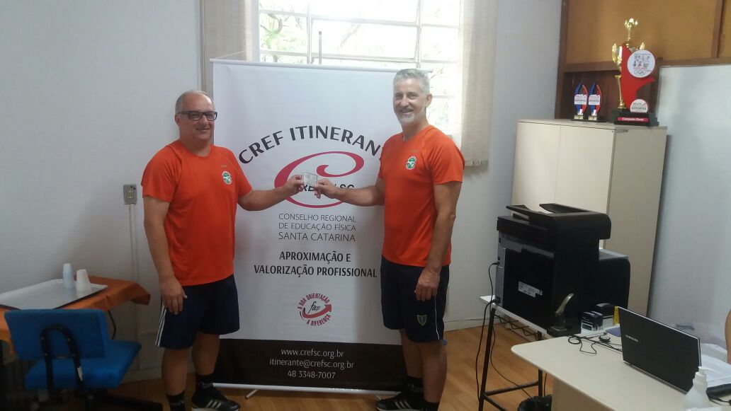 O CREF Itinerante está em Caçador até às 18 horas de hoje, 20 de dezembro, na Fundação Municipal de Esportes de Caçador, localizada no Parque Central José Rossi Adami. Cerca de 30 atendimentos foram realizados, entre eles renovação de CIP, como o profissional de Educação Física Miguel Angelo Dittrich (CREF 000682-G/SC), que renovou hoje sua cédula de identidade profissional (na foto com o 1º Secretário do CREF3/SC Marcelo Scharf (CREF 001050-G/SC)).