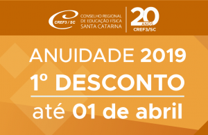 O boleto da Anuidade 2019 já está disponível no CREF Online, com desconto aplicado de acordo com a Resolução n° 0154/2018/CREF3/SC, válida para registrados no CREF3/SC até 31/12/2018 e vencimento em 31/03. Em fevereiro, os profissionais de Educação Física e empresas registradas começarão a receber o boleto no endereço cadastrado no sistema do Conselho, via Correios. Os descontos progressivos podem chegar a 80%, como no caso da Associação sem fins lucrativos. Mas, atenção para a data de pagamento: de acordo com a modalidade de boleto registrado, o pagamento deve ser efetuado até a data que consta no boleto (01/04, data alterada em função do dia 31/03 vencimento do primeiro desconto da anuidade não ser dia útil).