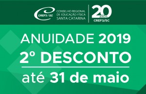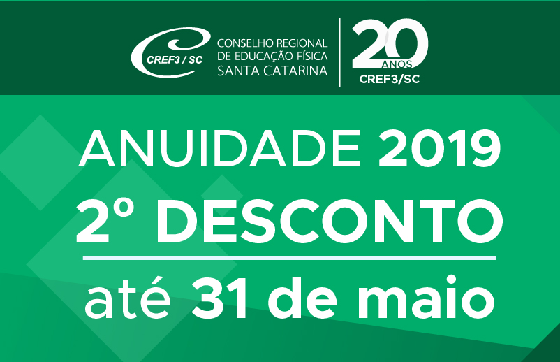 Não aproveitou o primeiro desconto para pagamento da Anuidade 2019? Até o dia 31 de maio, é possível pagar a anuidade com 35% de desconto. Retire o boleto no CREF Online ou pelo DDA de seu banco. Fique atento: o endereço desatualizado é a principal causa do não recebimento dos boletos. Mantenha seu cadastro atualizado!