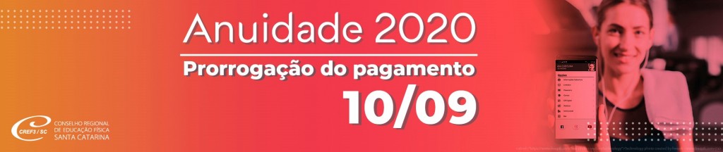 Considerando os impactos econômicos que os profissionais de Educação Física vêm enfrentando em decorrência do novo coronavírus (COVID-19), o CREF3/SC prorroga novamente o vencimento da anuidade 2020, para os registrados até 31/12/2019 e oferece ainda opções de parcelamento em 3 vezes, no cartão de crédito.