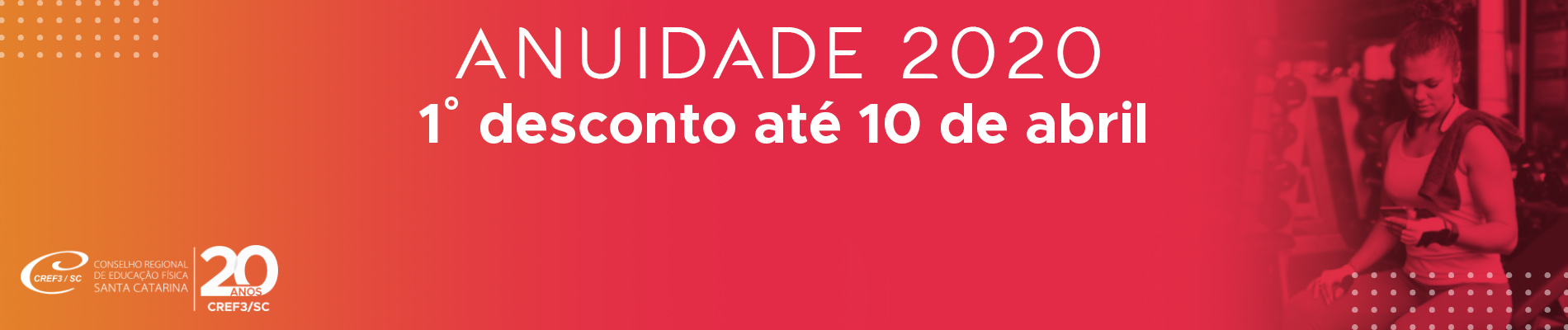 Ao gerar o boleto da Anuidade 2020 no App do Conselho, fique atento para a data de vencimento do documento: a guia estará com data para o último dia do mês. No entanto, o primeiro desconto vai até o dia 10/04, de acordo com a Resolução n° 0179/2019/CREF3/SC, válida para registrados no CREF3/SC até 31/12/2019.