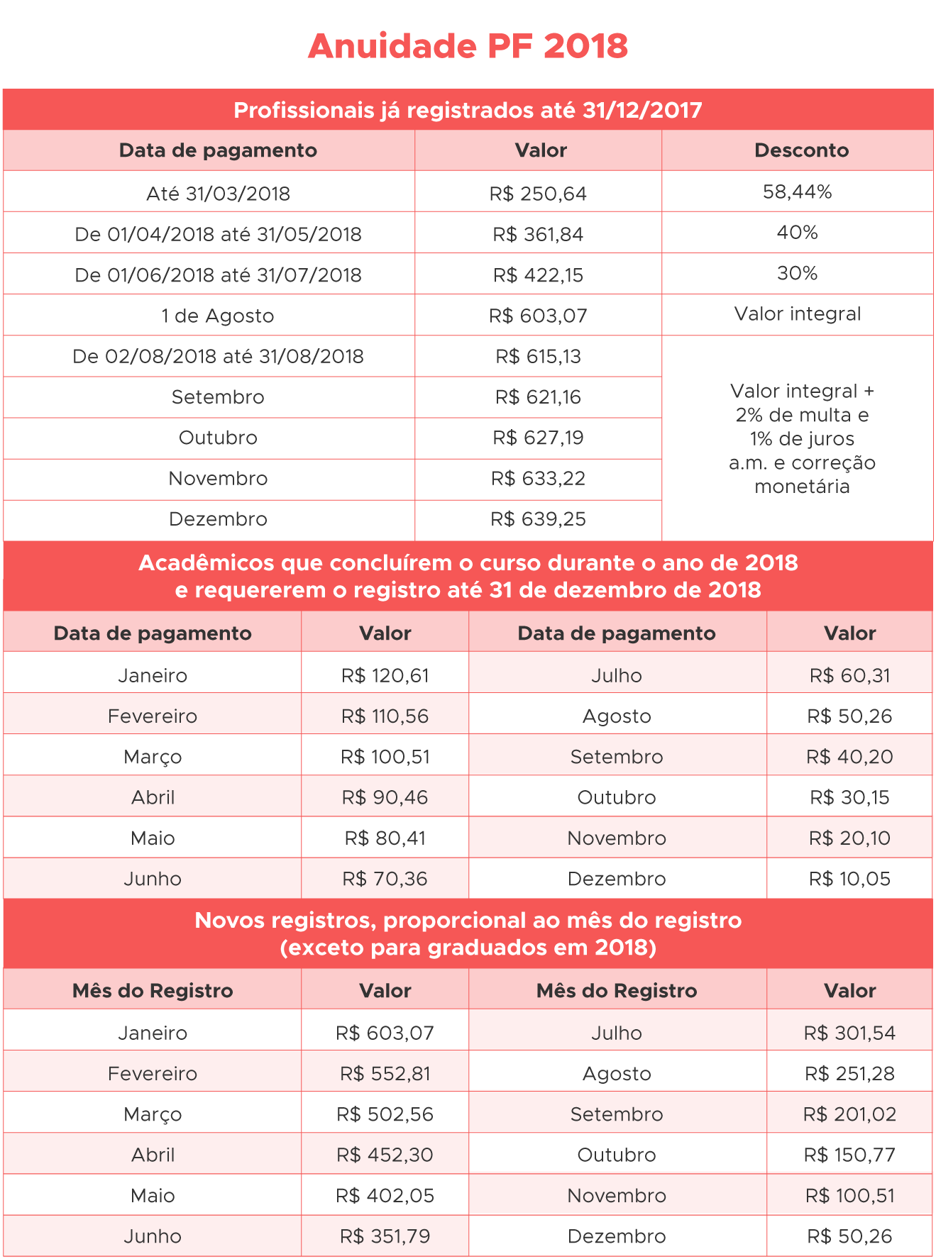 Os valores, estabelecidos pela Resolução n° 0137/2017/CREF3/SC, não foram reajustados e permanecem os mesmos de 2017. Profissionais de Educação Física têm três opções de desconto para quitação da anuidade, veja aqui a tabela. Já os estabelecimentos contam com uma nova uma política de anuidades, com descontos progressivos, confira os detalhes aqui.