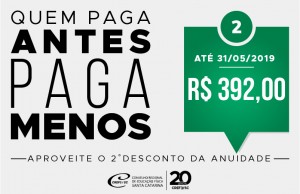 Para pagamento até 31/05/2019 – emitir novo boleto em CREF Online, que terá o valor de R$ 392,00