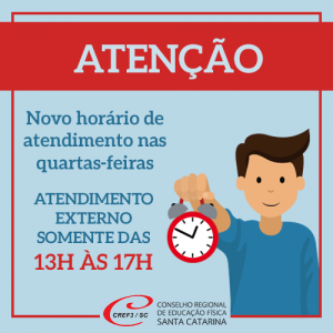 A partir de março, o CREF3/SC contará com horário de atendimento externo diferenciado nas quartas-feiras, das 13h às 17 horas. No período matutino, o Conselho estará fechado para trabalho interno. Nos outros dias, o horário permanece igual: das 8h30 às 17hs.