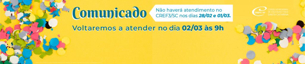 Em razão do feriado de Carnaval, o CREF3/SC estará fechado nos dias 28/02 e 1/03. Na quarta-feira de cinzas, 2 de março, as atividades serão retomadas a partir das 9 horas.
