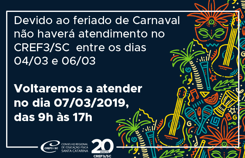 Carnaval2019Em razão do feriado de Carnaval, o CREF3/SC estará fechado nos dias 4, 5 e 6 de março. Na quarta-feira de cinzas, 6 de março, o período vespertino será destinado para trabalho interno. As atividades serão retomadas na quinta-feira, 7 de março, das 9h às 17 horas.