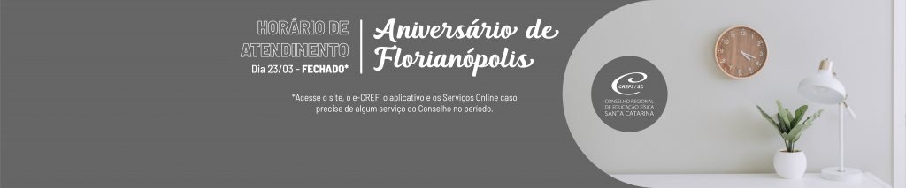 O CREF3/SC estará fechado no dia 23 de março devido ao feriado municipal de aniversário de Florianópolis.