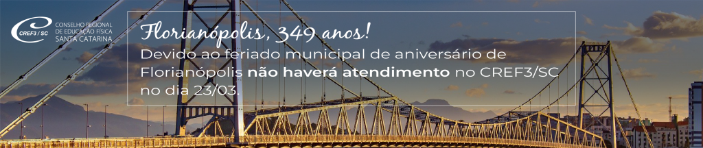 O CREF3/SC estará fechado no dia 23 de março devido ao feriado municipal de aniversário de Florianópolis.