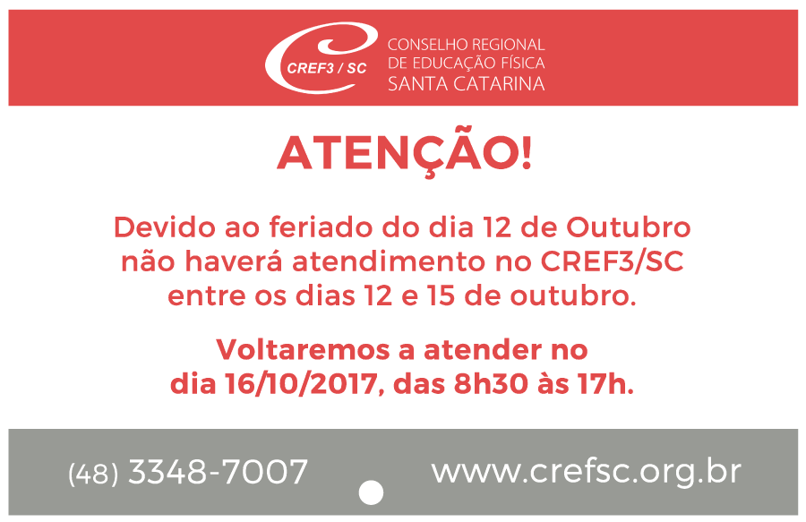 Atenção profissionais: o CREF3/SC estará fechado entre os dias 12 e 15/10 - CREF3/SC - Conselho Regional de Educação Física de SC