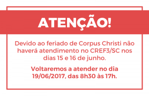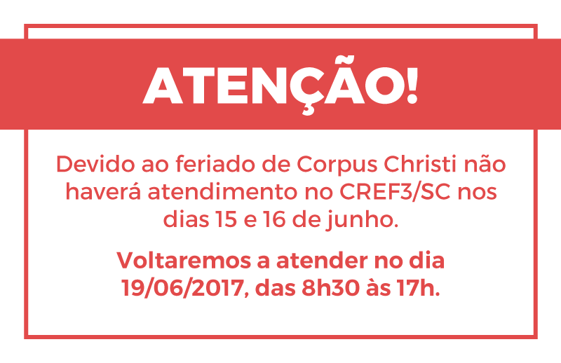 Em razão do feriado de Corpus Christi, o CREF3/SC estará fechado nos dias 15 e 16 de junho. Se precisar de algum serviço durante o feriado, acesse os Serviços Online para atualizar dados, emitir guias e certidões, entre outras coisas.