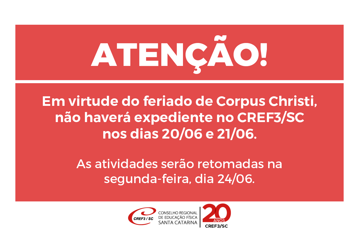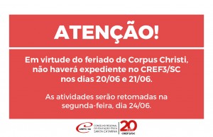Atenção profissionais: o CREF3/SC estará fechado nos dias 20 e 21 de junho - CREF3/SC - Conselho Regional de Educação Física de SC