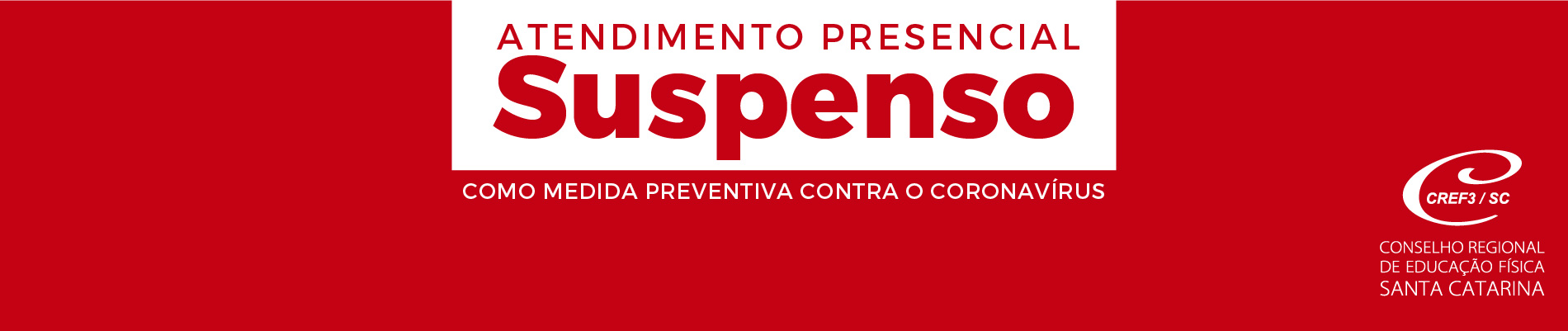 Atendimento Suspenso (2)Com a prorrogação das medidas de isolamento social por mais sete dias, anunciadas pelo governo do Estado por meio do Decreto 525/2020, a diretoria do CREF3/SC, cumprindo a determinação, comunica aos profissionais continua suspenso o atendimento presencial no Conselho. Os funcionários do CREF3/SC continuam exercendo suas atividades em home office. Os profissionais que necessitarem dos serviços da instituição poderão acessar os canais de atendimento online.