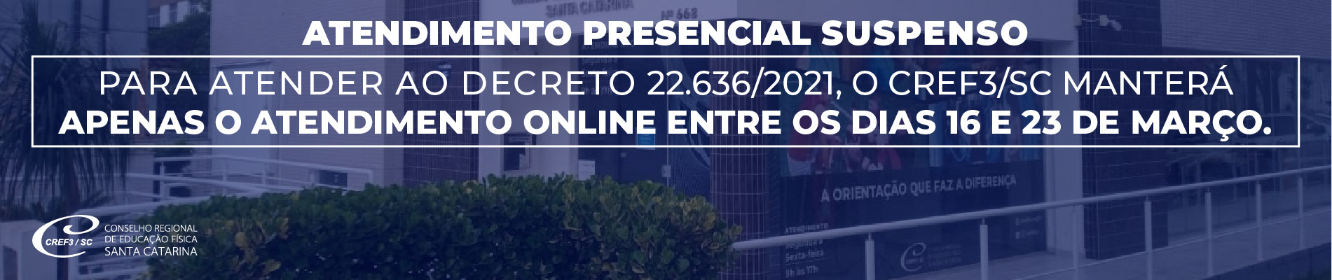 Em respeito ao Decreto 22.636, de 15 de março de 2021, da prefeitura de Florianópolis, o CREF3/SC manterá apenas o atendimento online entre os dias 16 e 23 de março. Ressaltamos que os serviços continuarão a ser prestados pelos funcionários do CREF3/SC, que continuam exercendo suas atividades em home office.
