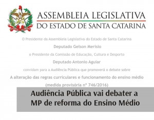 A Assembleia Legislativa de Santa Catarina promove Audiência Pública sobre a Medida Provisória de reforma do Ensino Médio (MP 746/2016) no dia 7 de novembro, às 16 horas, no Plenarinho Deputado Paulo Stuart Wright. Proposta pela Comissão de Educação Cultura e Desporto, a audiência é aberta ao público e o CREF3/SC convida os profissionais de Educação Física do Estado a debaterem o futuro da Educação Física na educação.