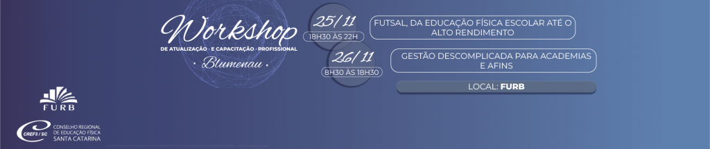 Blumenau encerra a série de Workshops de Capacitação e Atualização Profissional realizados pelo CREF3/SC em 2022, na FURB, dias 25 e 26 de novembro. O evento trará os cursos “Futsal, da Educação Física Escolar até o Alto Rendimento”, com o prof. Me. Marcos Xavier de Andrade (CREF 001717-G/SC) e “Gestão descomplicada para Academias e afins”, ministrado pelo prof. Dr. Rogério Soares (CREF 035464-G/SP), que contará com a participação do prof. esp. Regis Soares (CREF 000009-G/SC), que trará informação sobre Responsabilidade Técnica de estabelecimentos que prestam serviços de atividade física.