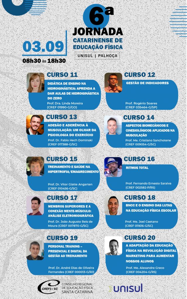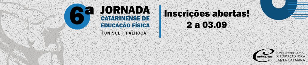 Conectando pessoas, o CREF3/SC realiza a 6ª Jornada Catarinense de Educação Física, nos dias 2 e 3 de setembro. O evento retorna à Unisul Pedra Branca com 20 cursos, no maior encontro promovido pelo Conselho em Santa Catarina. Vem com a gente atualizar seus conhecimentos em dois dias intensos de muito aprendizado, com temas pensados especialmente para os profissionais e acadêmicos da área.