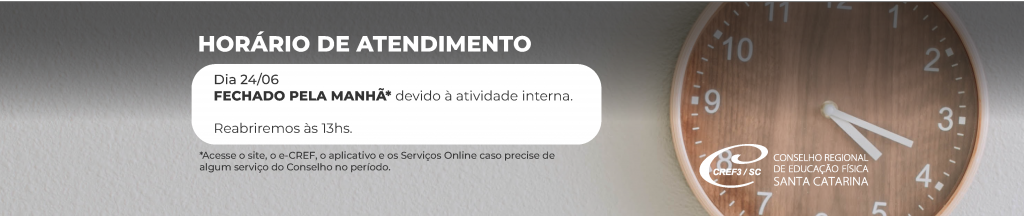 Em razão de uma atividade interna, não haverá atendimento externo no período matutino da próxima sexta-feira, 24/06. O atendimento ao profissional na sede do CREF3/SC iniciará às 13h.