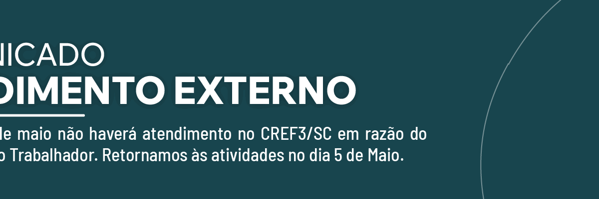 Não haverá atendimento presencial no CREF3/ SC nos dias 1 e 2 de Maio, em razão do feriado do Dia do Trabalhador e do Ponto Facultativo decretado pelo prefeito de Florianópolis. Retornaremos as atividades no dia 5 de maio.