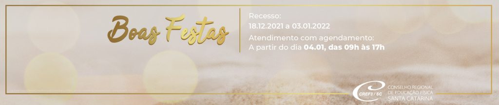 Atenção profissionais de Educação Física: devido ao período de recesso de final de ano, o CREF3/SC estará fechado entre os dias 18 de dezembro e 3 de janeiro de 2022. O atendimento externo será retomado no dia 4 de janeiro, com atendimento agendado via whatsapp (48 3348-7007), das 9h às 16hs.