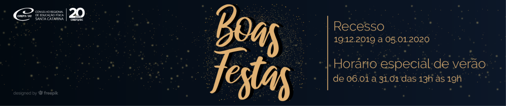 Atenção profissionais de Educação Física: devido ao período de recesso de final de ano, o CREF3/SC estará fechado entre os dias 19 de dezembro e 5 de janeiro de 2020. As atividades do Conselho serão retomadas no dia 6 de janeiro, em horário especial, das 13h às 19hs.