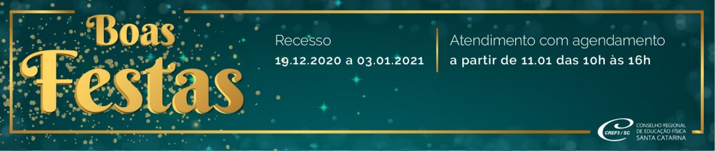 Recesso Ano Novo-04Atenção profissionais de Educação Física: devido ao período de recesso de final de ano, o CREF3/SC estará fechado entre os dias 19 de dezembro e 3 de janeiro de 2021. O atendimento externo será retomado no dia 11 de janeiro, com atendimento agendado via whatsapp (48 99616-2644), das 10h às 16hs.