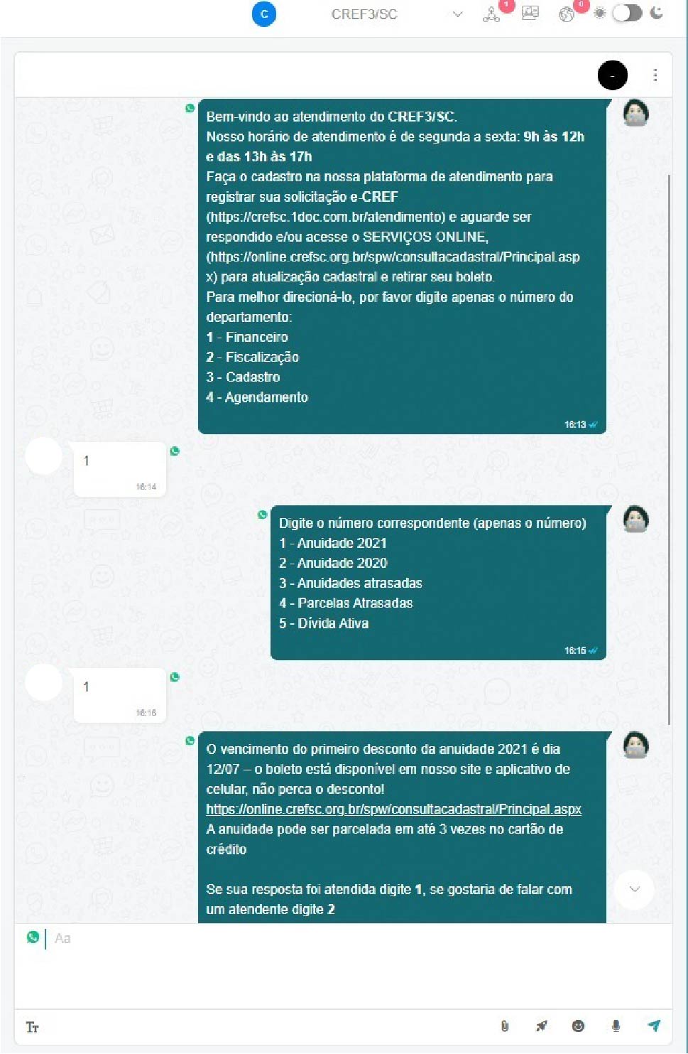A partir de agora, o atendimento online realizado pelo CREF3/SC, via whatsapp, será centralizado no número (48) 3348-7007, contato de telefone fixo da sede, e já amplamente conhecido pelos profissionais de Educação Física. O atendimento é iniciado pela “Catarina”, o chatbot do Conselho Regional de Educação Física de Santa Catarina, que faz a triagem e a distribuição das demandas aos departamentos responsáveis, agilizando o processo.