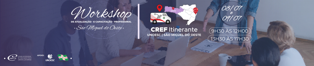 Profissionais que precisem resolver pendências de forma presencial com o Conselho, podem aproveitar o CREF Itinerante que estará nos dias 8 e 9 de julho, na Unoesc, em São Miguel do Oeste, durante o Workshop de Capacitação e Atualização Profissional. Aproveite para renovar a Cédula de Identidade Profissional, realizar o registro de Pessoa Física e Jurídica, negociar pendências, retirada de certidões, além de tirar dúvidas sobre fiscalização e sobre a regulamentação da atividade profissional de Educação Física.