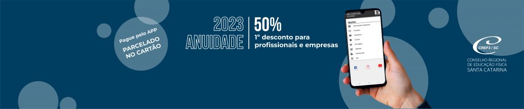 Mais uma vez, o valor da anuidade do CREF3/SC segue sem reajuste para Profissionais e Empresas, contando ainda com descontos e parcelamentos diferenciados via APP e cartão de crédito.