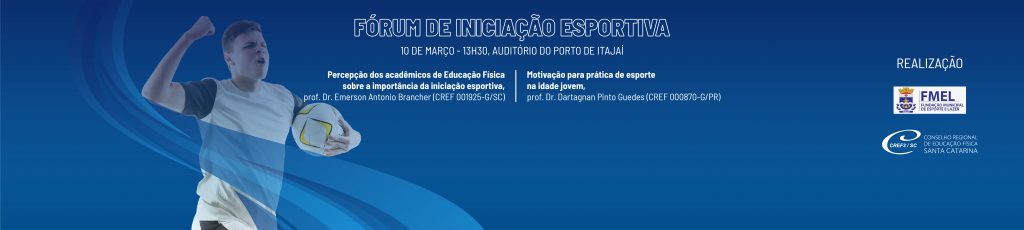 O CREF3/SC e a Fundação Municipal de Esporte e Lazer de Itajaí realizam o Fórum de Iniciação Esportiva, no dia 10 de março, das 13h30 às 17h30, no auditório do Porto de Itajaí. Com os temas “Percepção dos acadêmicos de Educação Física sobre a importância da iniciação esportiva”, ministrado pelo prof. Dr. Emerson Antonio Brancher (CREF 001925-G/SC), e “Motivação para prática de esporte na idade jovem”, com o prof. Dr. Dartagnan Pinto Guedes (CREF 000870-G/PR), o evento pretende debater os fundamentos da iniciação esportiva e sua relevância no ensino da Educação Física.