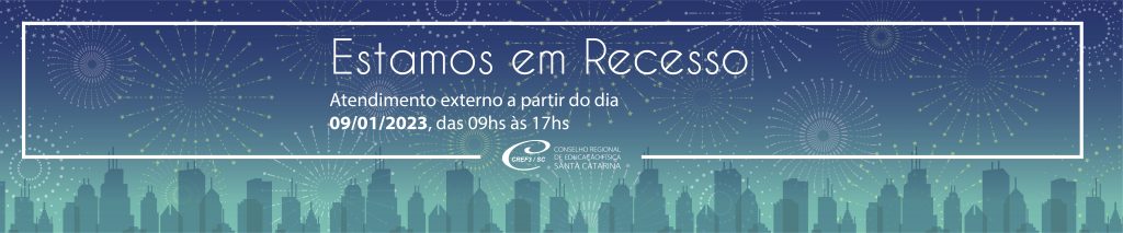 Devido ao período de recesso, o CREF3/SC estará fechado até o dia 4 de janeiro de 2022. O Conselho retomará o atendimento externo no dia 9 de janeiro, das 9h às 17hs.