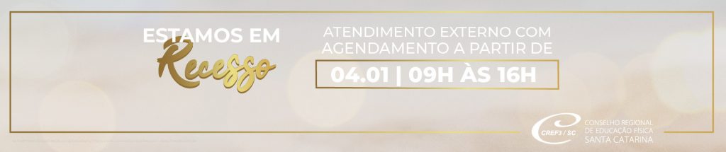 Devido ao período de recesso, o CREF3/SC estará fechado até o dia 4 de janeiro de 2022. O atendimento externo será retomado no dia 4 de janeiro, com atendimento agendado via whatsapp (48 3348-7007), das 9h às 16hs.