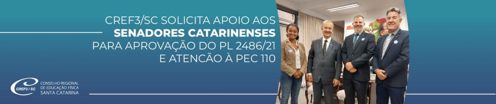 O presidente do CREF3/SC, Emerson Brancher (CREF 001925-G/SC) e o secretário geral do CREF3/SC, Jean Carlo Leutprecht (CREF 000012-G/SC), em agenda em Brasília, visitaram os gabinetes dos senadores catarinenses Dario Berger, Esperidião Amin e Jorginho Melo, ontem, 15 de março. O objetivo foi solicitar apoio dos senadores para a aprovação do Projeto de Lei nº 2486/21, que altera a Lei nº 9.696, de 1º de setembro de 1998, que pretende oferecer segurança jurídica a? manutenção e ao funcionamento dos Conselhos Federal e Regionais de Educação Física. Na oportunidade, também solicitaram atenção à PEC 110, que trata da reforma tributária e que pode gerar um aumento significativo nos custos tributários sobre serviços para profissionais e empresas.