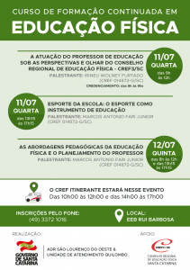04Com o objetivo de oferecer subsídios teóricos, práticos e metodológicos aos professores de Educação Física, a ADR de São Lourenço do Oeste e a Unidade de Atendimento de Quilombo realizam curso de Formação Continuada: Redimensionando teoria/Prática Pedagógica na Educação Física Escolar nos dias 11 e 12 de julho, na EEB Rui Barbosa, em São Lourenço do Oeste. O curso é gratuito para profissionais de Educação Física da rede estadual e municipal de ensino das escolas e municípios de abrangência, e conta com apoio do CREF3/SC. As inscrições podem ser feitas pelo telefone: (49) 33721016.