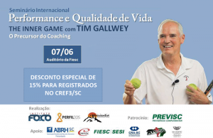 tim-gallweyO precursor do Coaching Tim Gallwey vem a Florianópolis no dia 7 de junho com o Seminário The Inner Game of Life (O jogo interior da vida). O evento será realizado no Auditório da Fiesc, e conta com apoio do CREF3/SC. Profissionais de Educação Física registrados no CREF3/SC têm 15% de desconto nos ingressos. Mais informações: eventos@institutofoco.com.br / (48) 99117-1319.