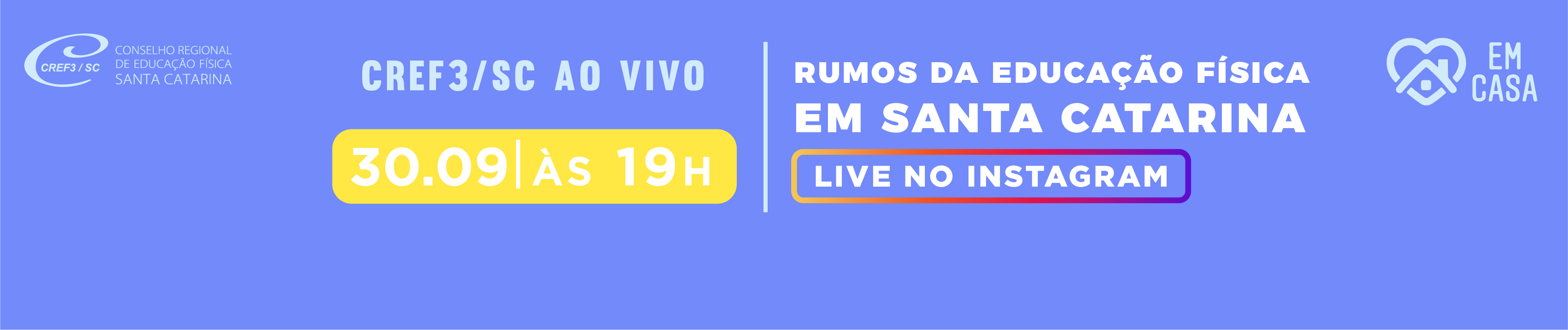 Quais os “Rumos da Educação Física em Santa Catarina”? Que desafios profissionais e gestores vêm enfrentando durante a pandemia e que lições serão aplicadas no futuro? Como o CREF3/SC vem contribuindo para o fortalecimento da profissão e pela valorização dos profissionais? Na próxima quarta-feira, 30 de setembro, às 19h, participe deste bate-papo da Live no Instagram do CREF3/SC. A live vai contar com a mediação do presidente do CREF3/SC, prof. Irineu Furtado (CREF 003767-G/SC) e do 2º vice-presidente do CREF3/SC, prof. Emerson Antônio Brancher (CREF 001925-G/SC), que receberão os gestores Gener Luz Junior e Fabiano Winiarski e os profissionais e gestores de academias Maria Cristina Bartczak (CREF 001195-G/SC), Luciano Rigotti Signori (CREF 010626-G/SC) e Fábio Santos Mello (CREF 009306-G/SC), para abordar como as empresas estão enfrentando a pandemia, além de destacar estratégias e ações para o futuro.