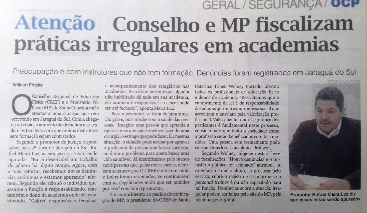 O Jornal Correio do Povo, de Jaraguá do Sul, publicou matéria sobre a ação e sobre possíveis práticas irregulares nas academias.