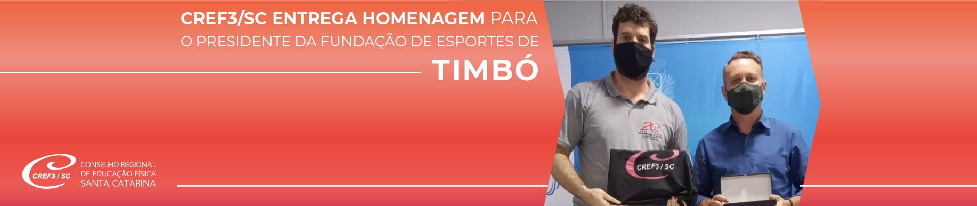 Na tarde de ontem, 10 de agosto, o chefe do departamento de Eventos/Comunicação, Robison Nunes, entregou uma homenagem do Conselho para o presidente da Fundação Municipal de Esportes de Timbó, Márcio Elísio (CREF 003164-G/SC), em agradecimento pelo apoio da prefeitura na realização do CREF Itinerante, que estava ontem na cidade.