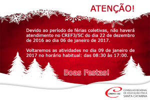 CREF3/SC estará fechado, em férias coletivas, de 22/12 a 06/01/2017 - CREF3/SC - Conselho Regional de Educação Física de SC