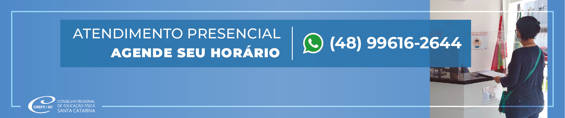 Se você precisa de um serviço do Conselho, agende data e horário via whatsapp (48 99616-2644), informando nome completo, número de registro e objetivo do atendimento. O atendimento será realizado das 10h às 16hs, a cada 30 minutos. A entrada para atendimento só será permitida ao profissional com atendimento agendado e que esteja utilizando máscara de proteção.