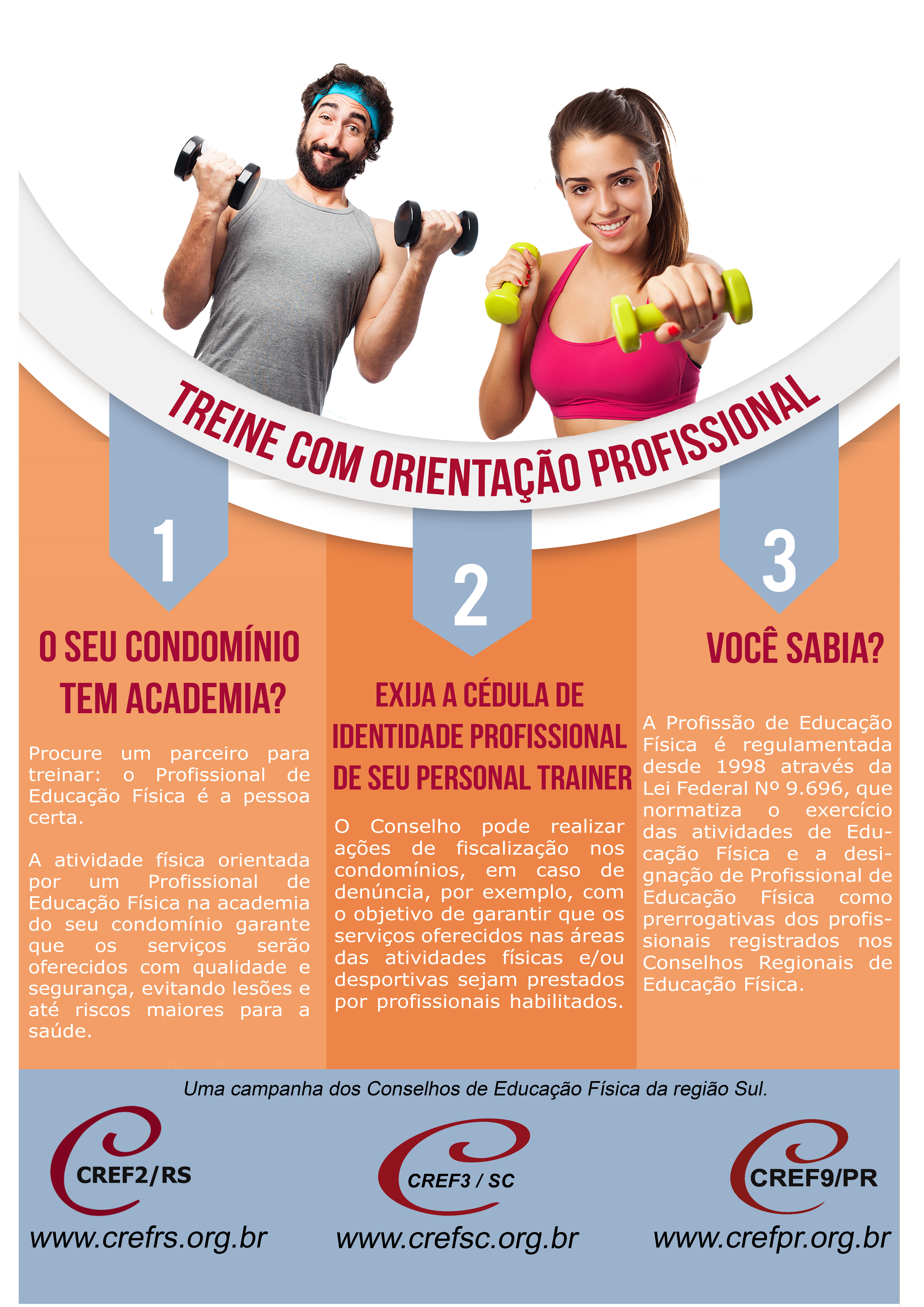 “A atividade física orientada por um Profissional de Educação Física na academia do seu condomínio garante que os serviços serão oferecidos com qualidade e segurança, evitando lesões e até riscos maiores para a saúde”, destaca Fabiano Braun de Moraes (CREF 001807-G/SC), presidente da Comissão de Orientação e Fiscalização do CREF3/SC.