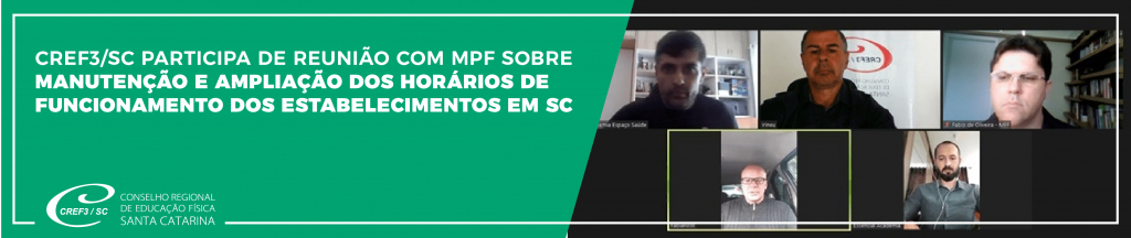 O presidente do CREF3/SC, prof. Irineu Wolney Furtado (CREF 003767-G/SC), participou hoje, 19 de abril, de reunião online com o Ministério Público Federal (MPF) para tratar da manutenção do funcionamento e da ampliação dos horários dos estabelecimentos que prestam serviços de atividade física em Santa Catarina. Nos próximos dias, uma nova reunião deve ser agendada com o Ministério Público Estadual para dar continuidade à pauta.