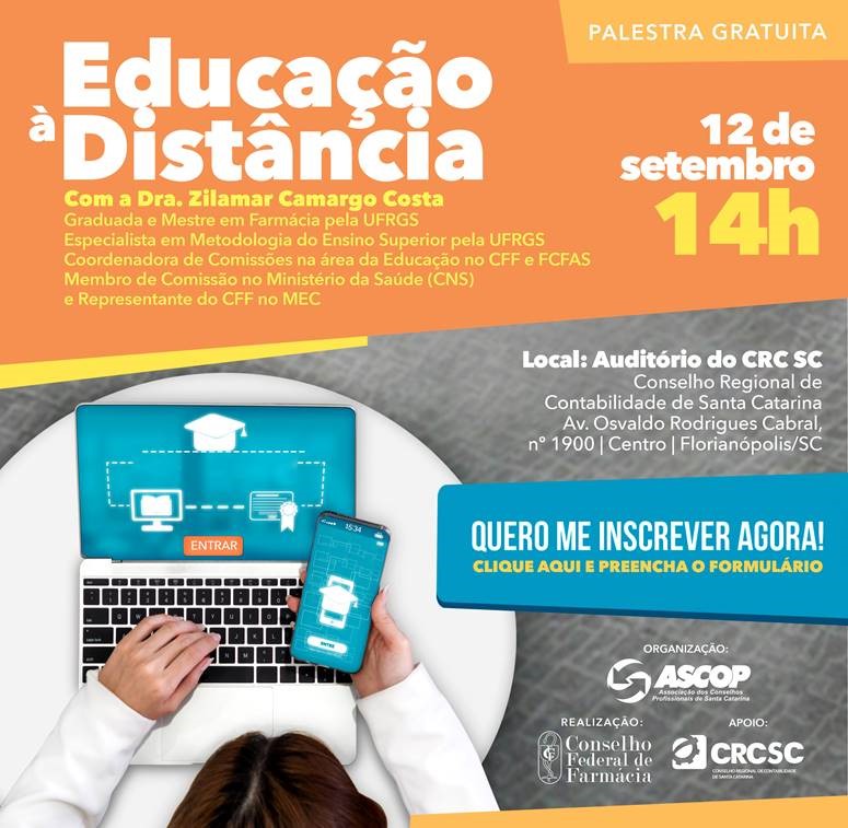 A Comissão realizou um censo com os dados e informações sobre os cursos EaD das categorias profissionais de cada Conselho representante. Foi reforçado o convite e o pedido de divulgação de palestra gratuita sobre Ensino a Distância, ministrada pela Dra. Zilamar Camargo Costa, que ocorrerá no dia 12 de setembro, às 14hs, no auditório do CRC/SC. Inscrições aqui.