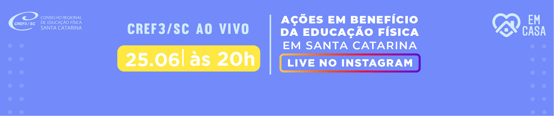 Na próxima quinta-feira, 25 de junho, às 20hs, venha para um bate-papo sobre as “Ações em benefício da Educação Física em Santa Catarina” no Instagram do CREF3/SC. A live traz o presidente do CREF3/SC, prof. Irineu Wolney Furtado (CREF 003767-G/SC) e o deputado Fernando Krelling (CREF 007007-G/SC), conselheiro do CREF3/SC, para falar das principais medidas tomadas para valorizar a profissão e o profissional de Educação Física neste período de pandemia.