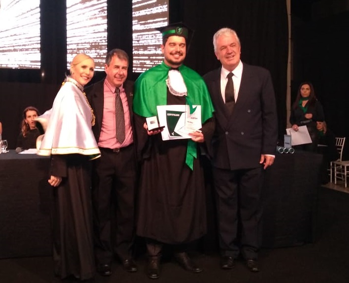 Na foto, a Reitora, o presidente do CREF3/SC, Fernando Slongo Rocha, formando em Licenciatura em Educação Física, que recebeu a medalha oferecida pelo CREF3/SC pelo seu desempenho acadêmico, e o profissional Oliveira Machado Fernandes Junior (CREF 001617-G/SC), homenageado da turma.