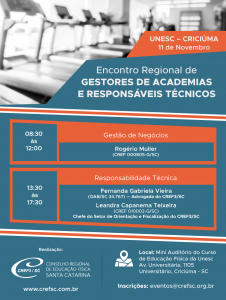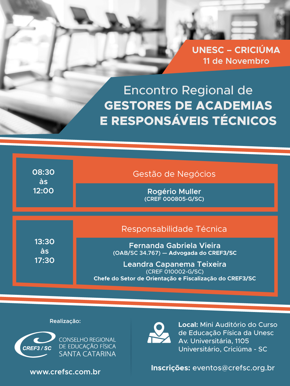 Com o objetivo de aperfeiçoar os serviços oferecidos pelas pessoas jurídicas registradas no CREF3/SC e ao mesmo tempo capacitar os proprietários, gestores e coordenadores para uma gestão de negócios mais eficiente e eficaz, o Conselho realiza no dia 11 de novembro o Encontro Regional de Gestores de Academias e Responsáveis Técnicos, na Unesc, em Criciúma. As inscrições são gratuitas e podem ser realizadas até o dia 8 de novembro no e-mail eventos@crefsc.org.br.
