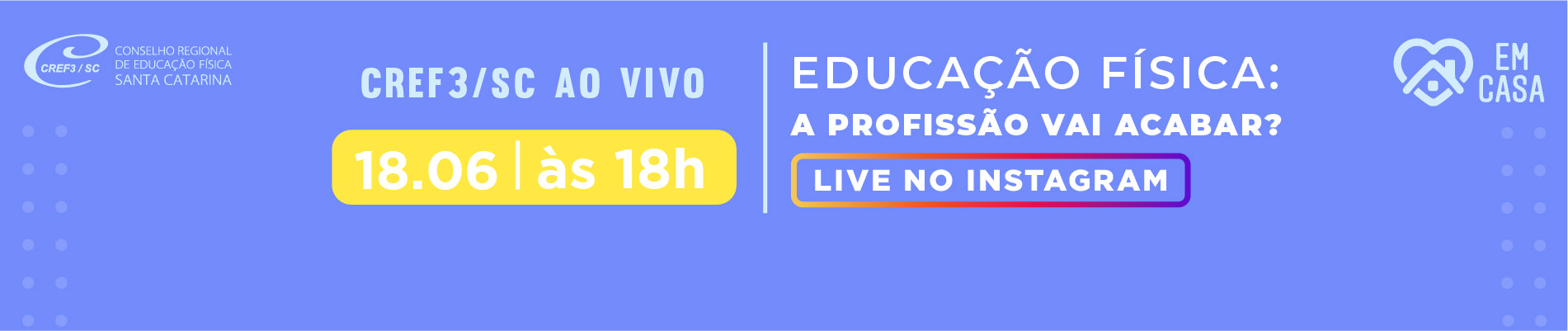 Live Cref 18.06-05A profissão Educação Física vai acabar? Seria o fim do Sistema CONFEF/CREFs e da regulamentação profissional? Você sabe do que trata a Ação Direta de Inconstitucionalidade (ADI 3428), que teve o julgamento retomado em 2020, porém suspenso no Supremo Tribunal Federal? Esses e outros assuntos serão tratados na Live “Educação Física: a profissão vai acabar?”, que acontece na próxima quinta-feira, 18/06, às 18hs, no Instagram no CREF3/SC. O presidente do CREF3/SC, prof. Irineu Wolney Furtado (CREF 003767-G/SC), recebe o presidente do CREF4/SP, Nelson Leme da Silva Junior (CREF 000200-G/SP).