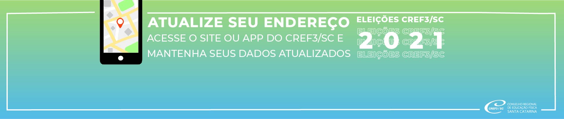 Confirme ou atualize seu endereço no APP do CREF3/SC ou nos Serviços Online e garanta o recebimento do material para votação nas Eleições 2021. O envelope com o material será encaminhado pelos Correios e necessita de tempo hábil para montagem e envio para o endereço dos profissionais de Educação Física aptos a votar. A votação somente será possível com o recebimento desse material.