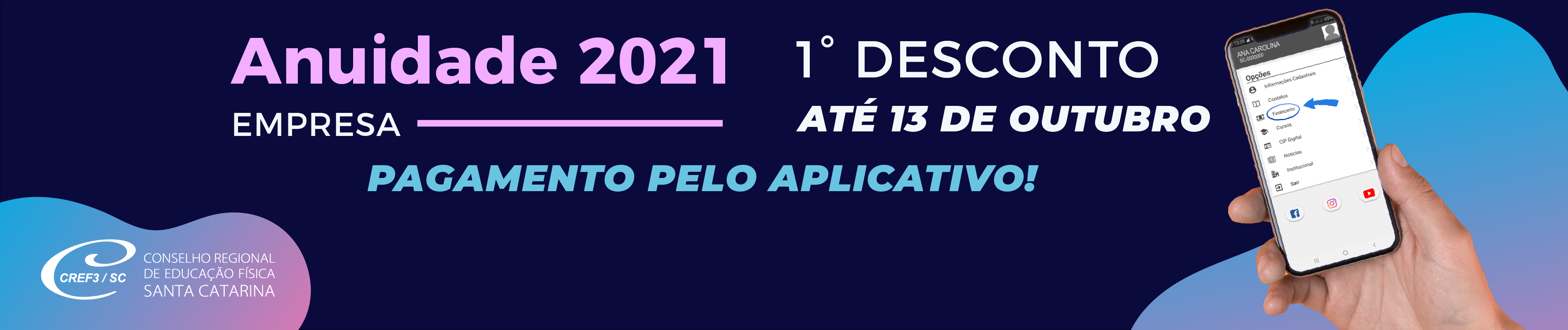 Prancheta 5@2xA partir de agora, empresas registradas no Conselho podem pagar a anuidade 2021 utilizando cartão de crédito nas bandeiras Visa, Mastercard, ELO e Hipercard. A facilidade está disponível no APP do CREF3/SC, utilizando uma plataforma virtual segura e ágil. Baixe o APP e aproveite para parcelar em 3x a anuidade 2021 e em até 12 vezes anuidades vencidas. Aproveite o primeiro desconto da anuidade até o dia 13 de outubro que, com desconto de 60% passa ao valor de R$ 596,16, de acordo com a Resolução nº 0187/2020/CREF3SC.