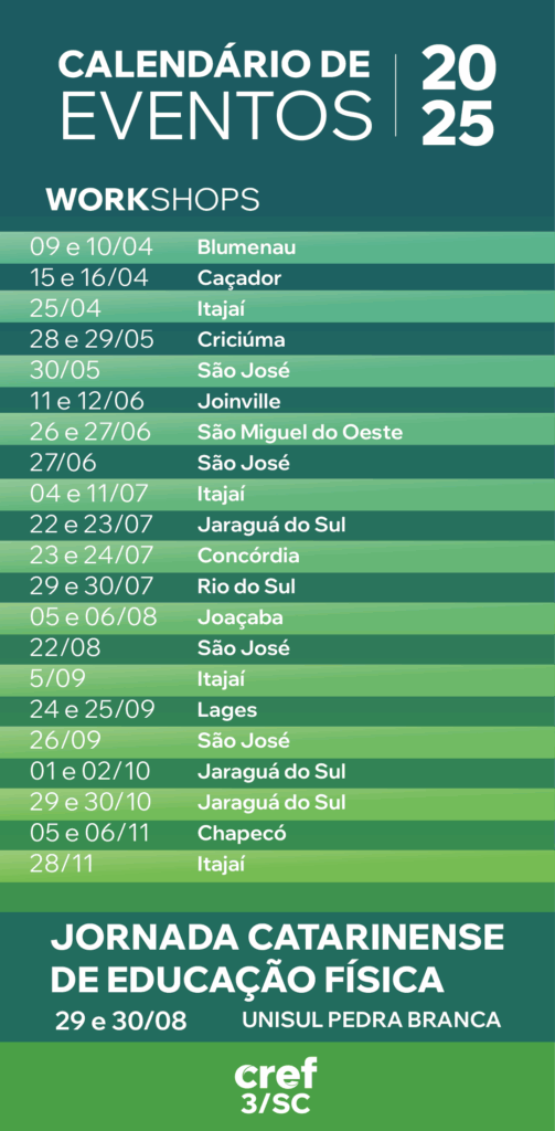 | Jornada Catarinense de Educação Física – Região Meio-Oeste | Joaçaba | 8 e 9/08 |