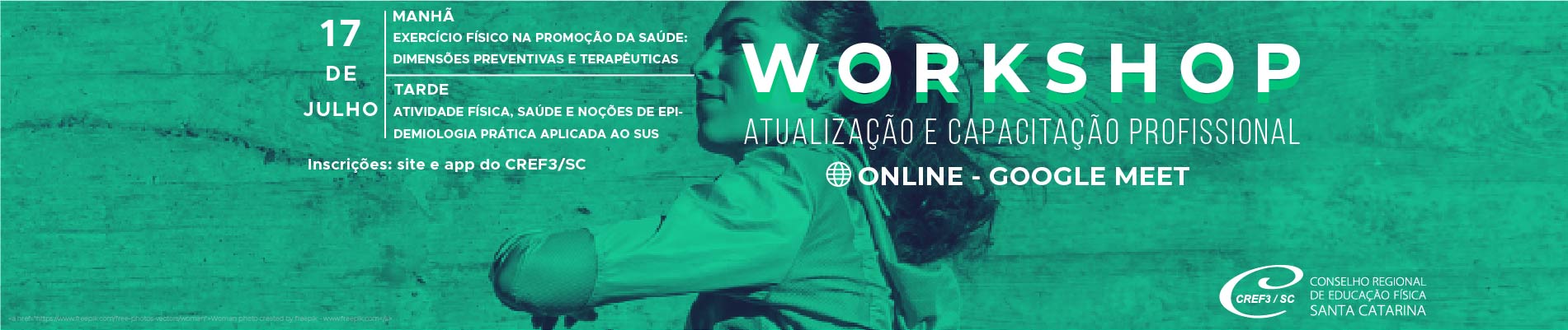 O Workshop de Atualização Online traz, no dia 17 de julho, dois cursos: na parte da manhã, acontece o workshop “Exercício Físico na Promoção da Saúde: dimensões preventivas e terapêuticas”, ministrado pelo Prof. Dr. Dartagnan Pinto Guedes (CREF 000870-G/PR), das 8h às 12h, e na parte da tarde o curso “Atividade física, saúde e noções de epidemiologia prática aplicada ao SUS”, ministrado pelo Prof. Dr. Paulo Sergio Cardoso da Silva (CREF 011846-G/SC), das 14h às 18hs. Os cursos serão realizados na Plataforma Google Meet.